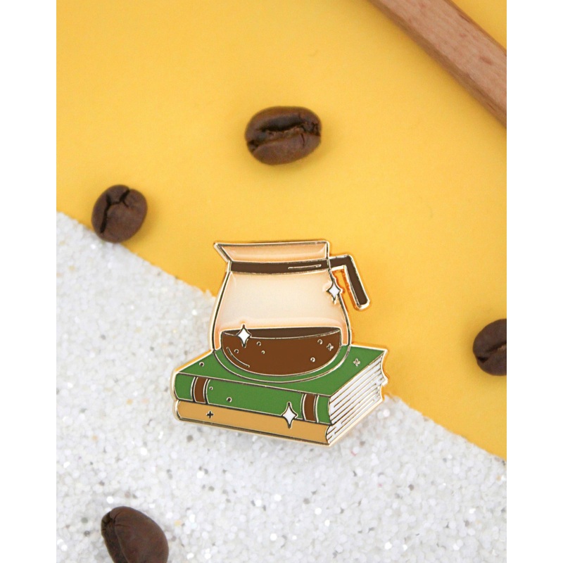 Coffee lovers and book lovers unite! A fresh pot of coffee will help wake you up so you can spend some time reading your favorite book. Or...perhaps will help keep you up so you can stay up late reading?This pin features translucent enamel on the "glass" o