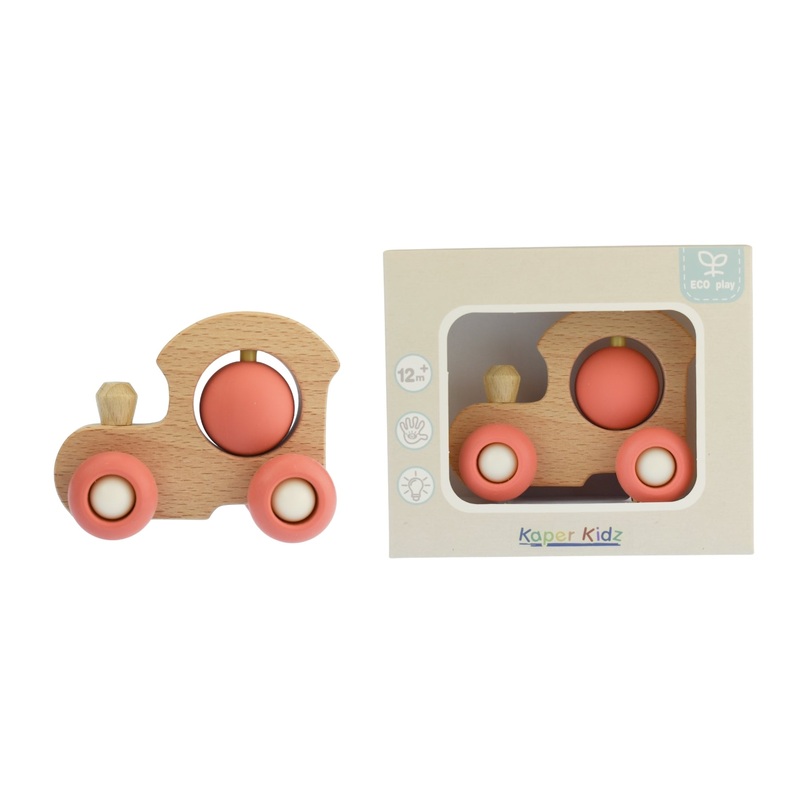 Introducing the Kaper Kidz EcoSpin Train, a delightful blend of eco conscious craftsmanship and joyful play. Crafted from durable beech wood and adorned with vibrant, flexible silicone in red accents, this train offers a tactile and engaging experience for young explorers.