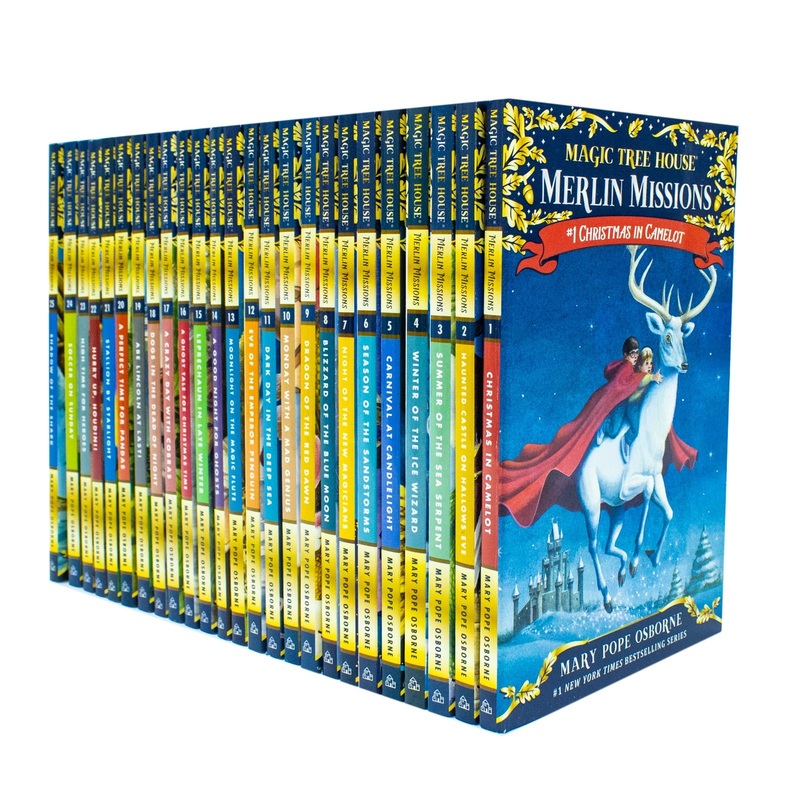 Books in this Merlin Missions set include:Christmas in Camelot(#1),Haunted Castle on Hallows Eve(#2),Summer of the Sea Serpent(#3),Winter of the Ice Wizard(#4),Carnival at Candlelight(#5),Season of the Sandstorm(#6),Night of the New Magicians(#7),Blizzard of the Blue Moon(#8),Dragon of the Red Dawn(#9),Monday with a Mad Genius(#10),Dark Day in the Deep Sea(#11),Eve of the Emperor Penguin(#12),Moonlight on the Magic Flute(#13),A Good Night for Ghosts(#14),Leprechaun in Late Winter(#15),A Ghost Tale for Christmas(#16),A Crazy Day with Cobras(#17),Dogs in the Dead of Night(#18),Abe Lincoln at Last(#19),A Perfect Time for Pandas(#20),Stallion by Starlight(#21),Hurry Up, Houdini!(#22),High Time for Heroes(#23),Soccer on Sunday(#24), andShadow of the Shark(#25).