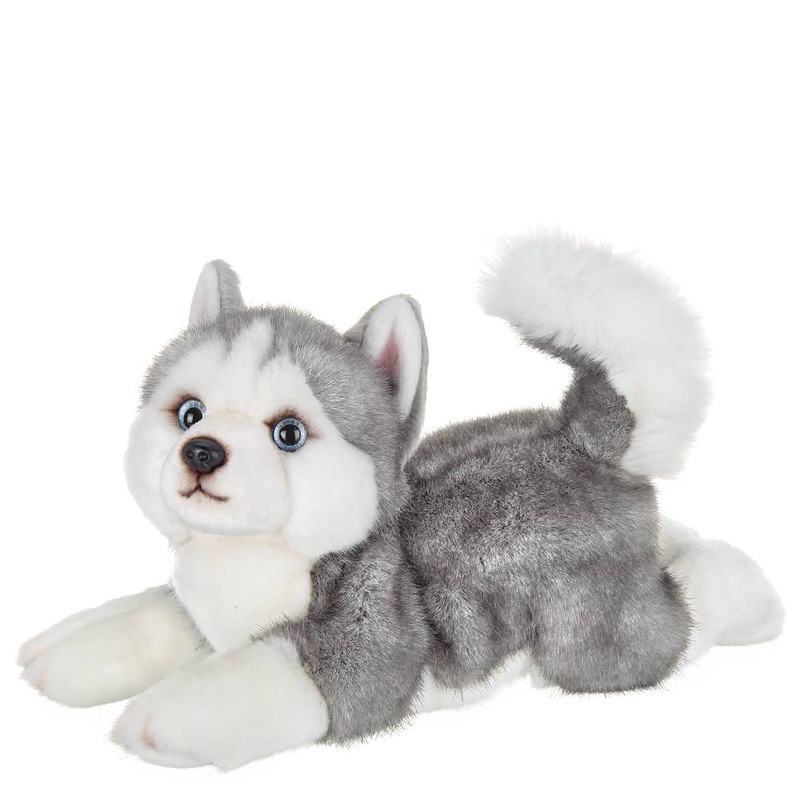Adorably cute grey and white Husky puppy dog plush toy with soft fur, sparkling eyes, and a soft floppy body, 15 long