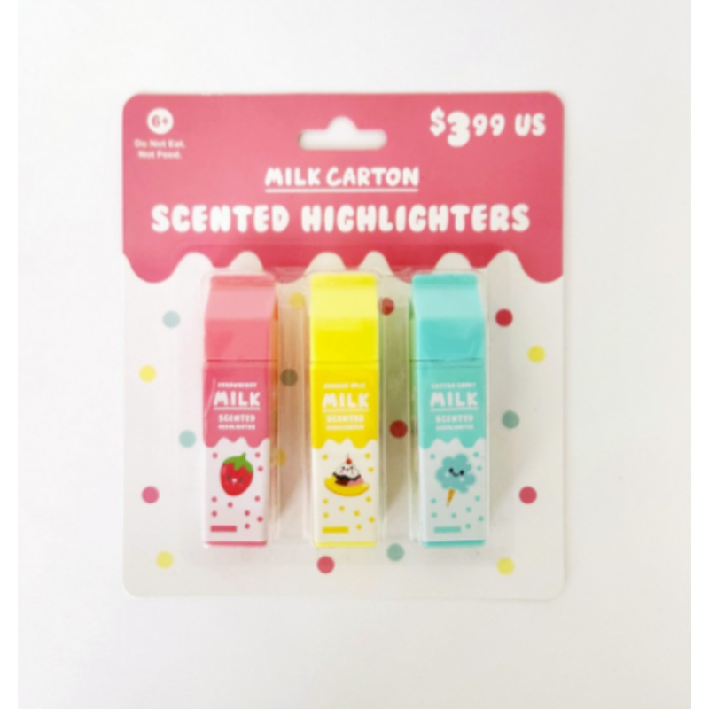 Make your ideas stand out with this adorable scented milk carton highlighter set.Set of three highlighters, including three different colors and scents: blue raspberry/ cotton candy blue, strawberry pink, and banana split yellow.