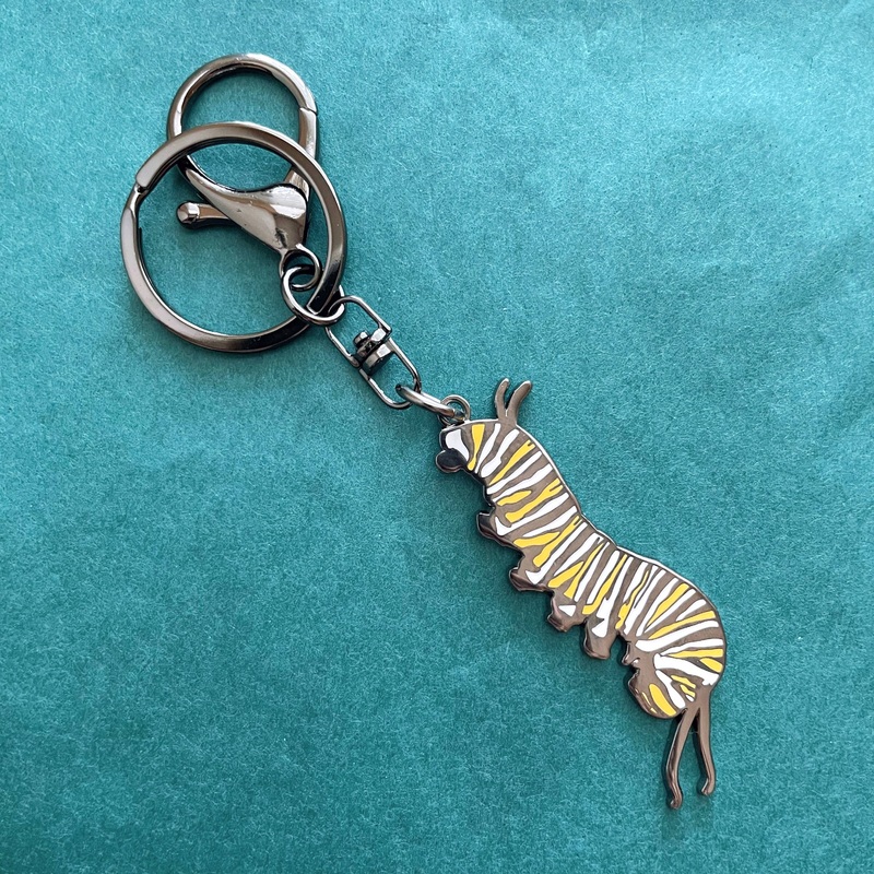 2.5 inch hard enamel keychain of my original monarch caterpillar illustration. Hardware is gunmetal black metal with lobster clasp and regular keyring.This is great for any pollinator enthusiast or lover of butterflies. Be sure to check out my other monarc