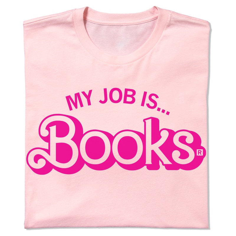 My Job is... Books. A Portion of All RAYGUN Sales Raise Money For Organizations That We Support. Rhodamine Pink Screen Print on a Light Pink T-shirt (100% Combed Ringspun Cotton). Cut and sewn sweatshop free. Designed and printed by Union Labor at RAYGUN.