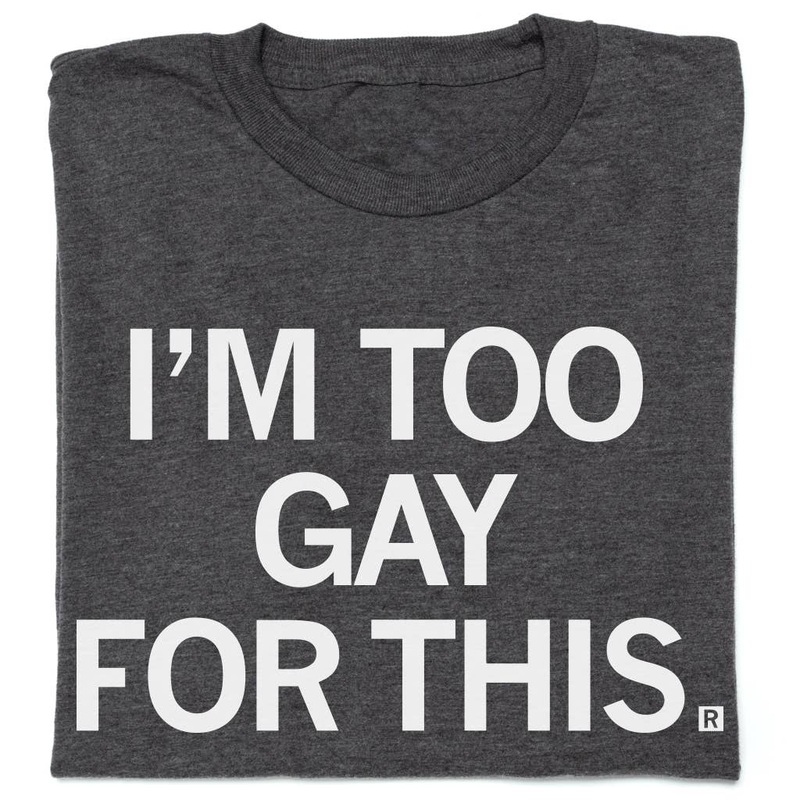 I’m Too Gay For This. A Portion of All RAYGUN Sales Raise Money For Organizations That We Support. White Screen Print on a Charcoal T-shirt (50% Combed Ringspun Cotton / 50% Polyester). Cut and sewn sweatshop free. Designed and printed by Union Labor at RAYGUN.