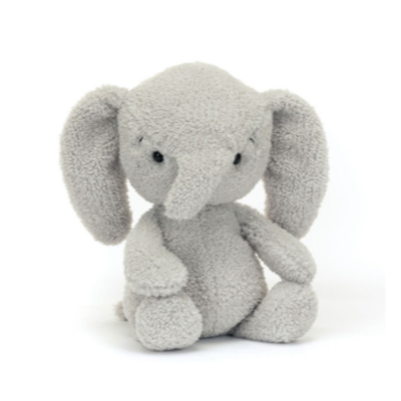 Rumblikin Elly is a gentle calf with short, textured grey fur.Elly's soft, chunky head and floppy ears are soothing to little travelers. With embroidered eyebrows, beany paws, a cute skewed trunk and bright black eyes, this baby elephant's going to be huge