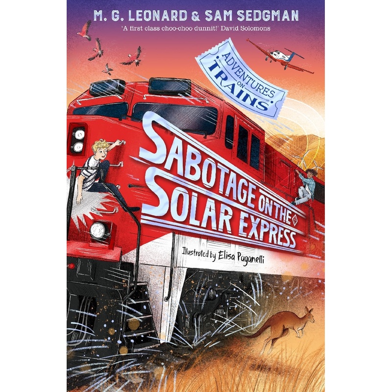 Ride into danger with Hal and Uncle Nat on the fifth breathtaking Adventures on Trains Mystery, Sabotage on the Solar Express, from bestselling award-winners M. G. Leonard and Sam Sedgman. Perfect for readers of 8 to 12 and brilliantly illustrated in black and white throughout by Elisa Paganelli. Billionaire train enthusiast August Reza has invited Harrison Beck and Uncle Nat to travel on the maiden voyage of the winning design of his Rezas Rocket competition. Australian child genius Boaz won with his hybrid locomotive, driven by hydrogen fuel cells and solar power. But during the journey from Alice Springs to Darwin, someone onboard sabotages the train, hurtling passengers into a heart-stopping thrill-ride across the Australian Outback. Can Hal find the saboteur and stop the runaway train before disaster strikes? Praise for the Series: ‘Like Murder on the Orient Express but better!’ – Frank Cottrell-Boyce on The Highland Falcon Thief ‘A thrilling and hugely entertaining adventure story’ – David Walliams on The Highland Falcon Thief ‘A first class choo-choo-dunnit!’ – David Solomons on Kidnap on the California Comet ‘A high-speed train journey worth catching . . .The best yet.’ – The Times on Murder on the Safari Star