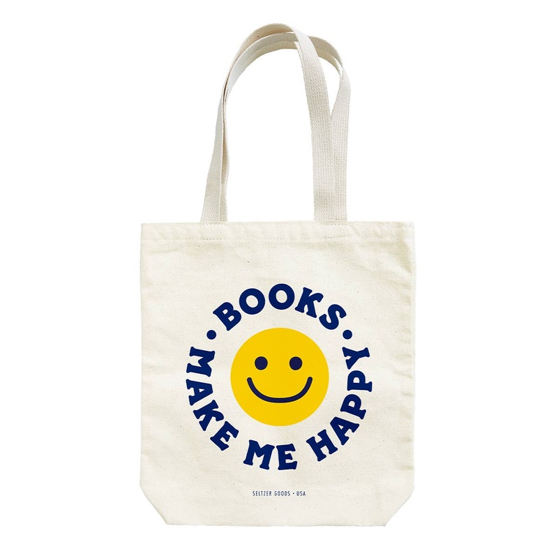 Minimum 2 totes per style. Suggested retail: $26.95 per toteBook bag size, 13.5″ W x 14.5″ H. Gusseted for extra capacityMade in the USA of strong cotton canvasWear a big smile everywhere you go with our Happy Books Smiley Tote. Made from 100% natural cotton canvas, what better way to show your favorite book some appreciation!Keywords: tote, natural, cotton, canvas, bag, book, reading, literary, literature, bookstore, store, blue, yellow, happy, retro, circle, happybooks