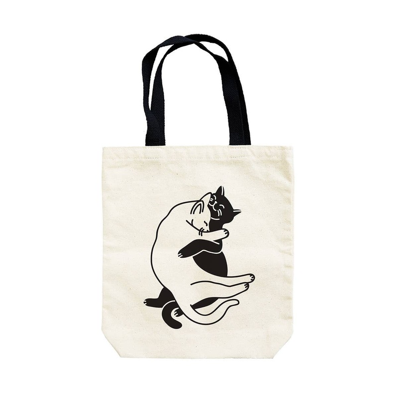 Book bag size, 13.5″ W x 14.5″ H. Gusseted for extra capacity Made in the USA of strong cotton canvas Hug it out, kitties! Theres a lot of love for this screen printed tote bag – its one of our best sellers!
